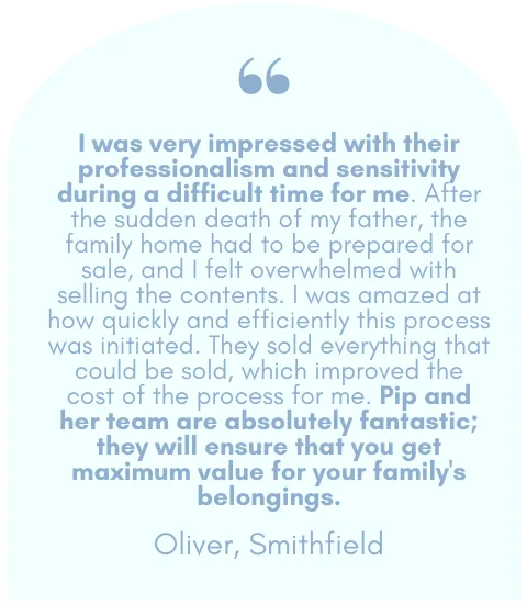 Pip just cleared my parents house and made the whole process completely stress free. She managed to sell what we wanted sold for more than I would have expected.. oversaw everything, organized charity collection and clearing out of rubbish. We didn't have to to do a thing. She is very organized and I really couldn't recommend her enough! Thank you again Pip!